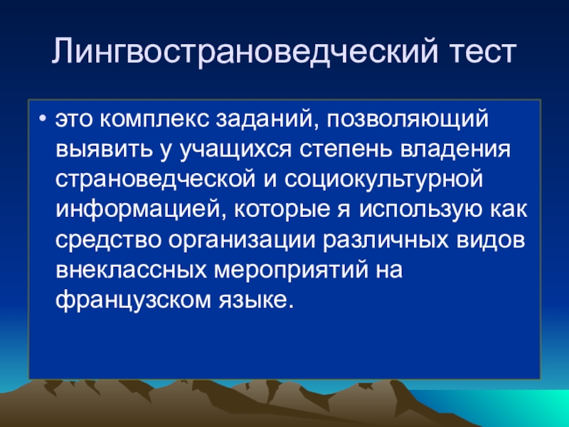 это комплекс заданий, позволяющий выявить у учащихся степень владения страноведческой