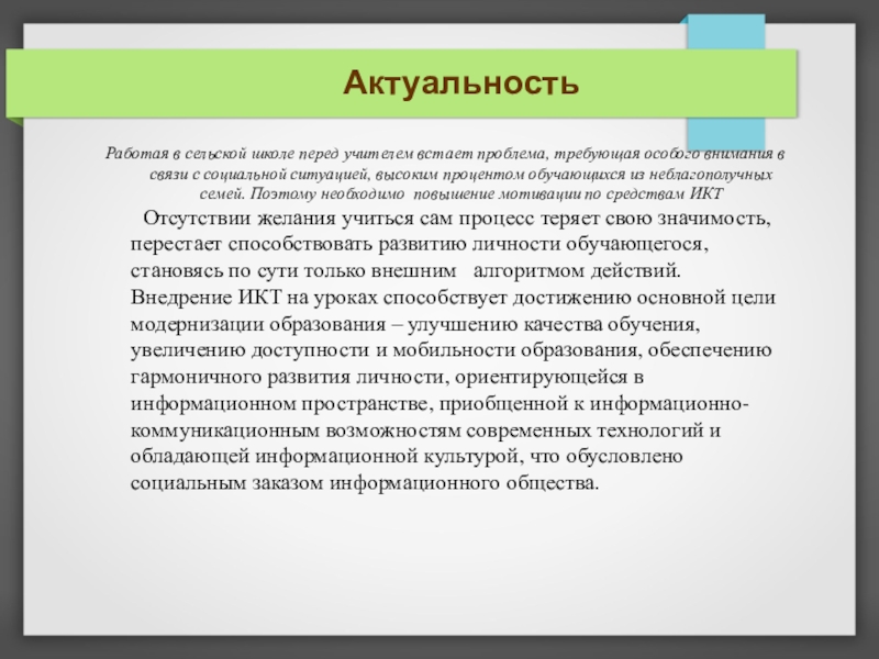 Отсутствии желания учиться сам процесс теряет свою значимость, перестает способствовать развитию личности обучающегося, становясь по сути только внешним алгоритмом действий. Внедрение ИКТ на уроках способствует достижению основной цели модернизации образования – улучшению качества обучения, увеличению доступности и мобильности образования, обеспечению гармоничного развития личности, ориентирующейся в информационном пространстве, приобщенной к информационно-коммуникационным возможностям современных технологий и обладающей информационной культурой, что обусловлено социальным заказом информационного общества.