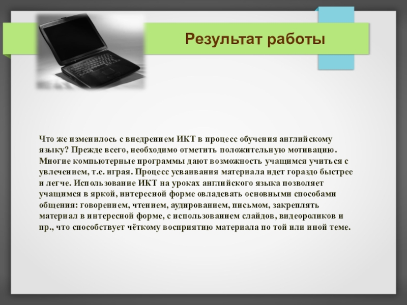 языку? Прежде всего, необходимо отметить положительную мотивацию. Многие компьютерные программы дают возможность учащимся учиться с увлечением, т.е. играя. Процесс усваивания материала идет гораздо быстрее и легче. Использование ИКТ на уроках английского языка позволяет учащимся в яркой, интересной форме овладевать основными способами общения: говорением, чтением, аудированием, письмом, закреплять материал в интересной форме, с использованием слайдов, видеороликов и пр., что способствует чёткому восприятию материала по той или иной теме.