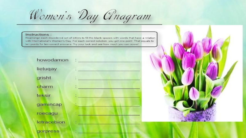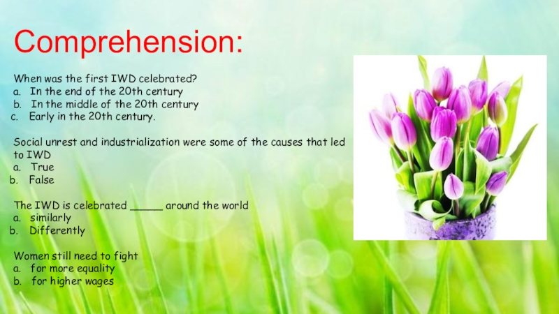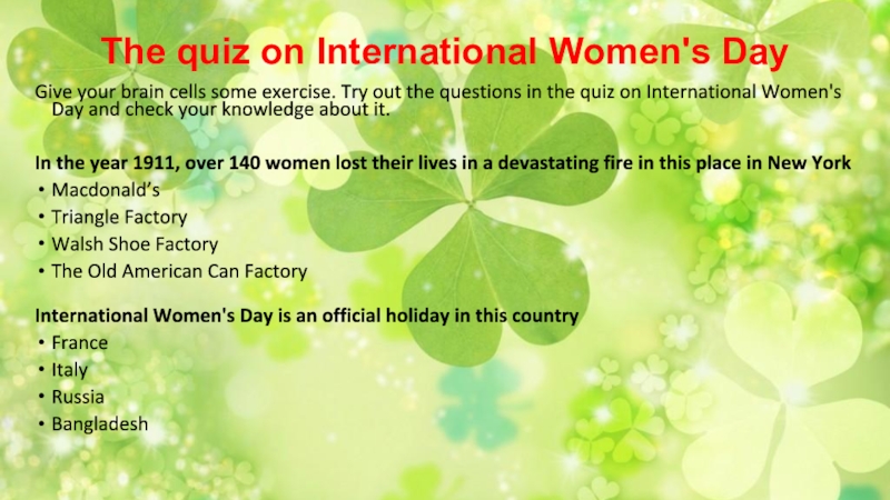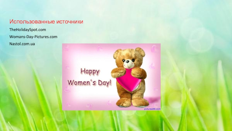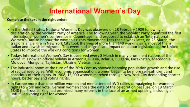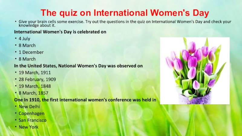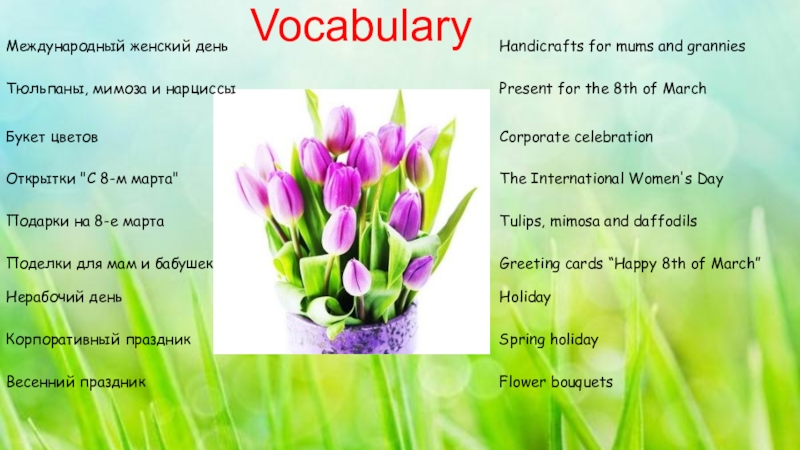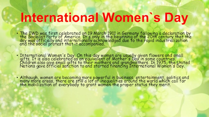 It is a good tradition in our country to give presents and flowers to women on this day. Each family celebrates this spring holiday. In the morning men go to the shops or markets to buy some flowers. They try to clean flats and help women to cook a holiday dinner.