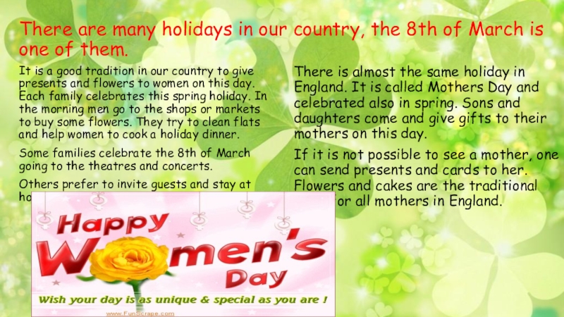 There is almost the same holiday in England. It is called Mothers Day and celebrated also in spring. Sons and daughters come and give gifts to their mothers on this day.