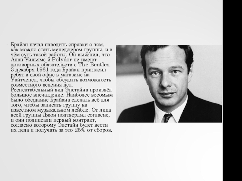 и в чём суть такой работы. Он выяснил, что Алан Уильямс и Polydor не имеют договорных обязательств с The Beatles. 3 декабря 1961 года Брайан пригласил ребят в свой офис в магазине на Уайтчепел, чтобы обсудить возможность совместного ведения дел. Респектабельный вид Эпстайна произвёл большое впечатление. Наиболее весомым было обещание Брайана сделать всё для того, чтобы записать группу на известном музыкальном лейбле. От лица всей группы Джон подтвердил согласие, и они подписали первый контракт, согласно которому Эпстайн будет вести их дела и получать за это 25% от сборов.