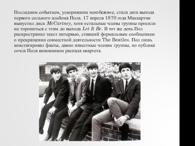Слайд 16Последним событием, ускорившим неизбежное, стала дата выхода первого сольного альбома Пола.