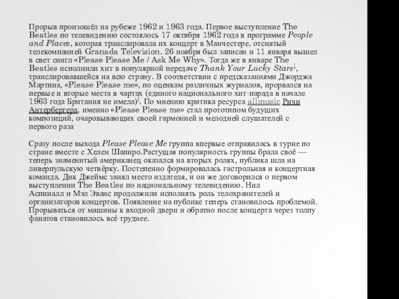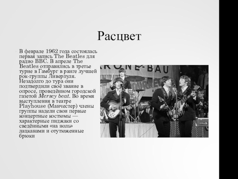 Слайд 13Прорыв произошёл на рубеже 1962 и 1963 года. Первое выступление The
