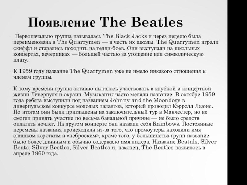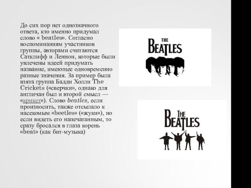 beatles». Согласно воспоминаниям участников группы, авторами считаются Сатклифф и Леннон, которые были увлечены идеей придумать название, имеющее одновременно разные значения. За пример была взята группа Бадди Холли The Crickets («сверчки», однако для англичан был и второй смысл — «крикет»). Слово beatles, если произносить, также отсылало к насекомым «beetles» («жуки»), но если видеть его напечатанным, то сразу бросался в глаза корень «beat» (как бит-музыка)