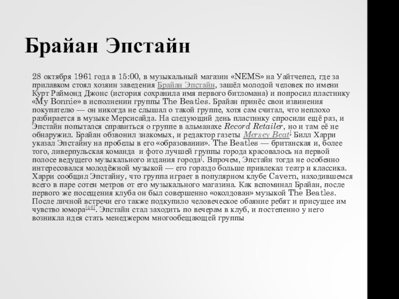 на Уайтчепел, где за прилавком стоял хозяин заведения Брайан Эпстайн, зашёл молодой человек по имени Курт Раймонд Джонс (история сохранила имя первого битломана) и попросил пластинку «My Bonnie» в исполнении группы The Beatles. Брайан принёс свои извинения покупателю — он никогда не слышал о такой группе, хотя сам считал, что неплохо разбирается в музыке Мерсисайда. На следующий день пластинку спросили ещё раз, и Эпстайн попытался справиться о группе в альманахе Record Retailer, но и там её не обнаружил. Брайан обзвонил знакомых, и редактор газеты Mersey Beat] Билл Харри указал Эпстайну на пробелы в его «образовании». The Beatles — британская и, более того, ливерпульская команда и фото лучшей группы города красовалось на первой полосе ведущего музыкального издания города[. Впрочем, Эпстайн тогда не особенно интересовался молодёжной музыкой — его гораздо больше привлекал театр и классика. Харри сообщил Эпстайну, что группа играет в популярном клубе Cavern, находившемся всего в паре сотен метров от его музыкального магазина. Как вспоминал Брайан, после первого же посещения клуба он был совершенно «околдован» музыкой The Beatles. После личной встречи его также подкупило человеческое обаяние ребят и присущее им чувство юмора[46]. Эпстайн стал заходить по вечерам в клуб, и постепенно у него возникла идея стать менеджером многообещающей группы