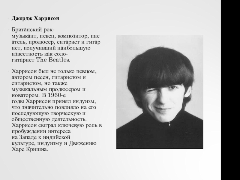 Британский рок-музыкант, певец, композитор, писатель, продюсер, ситарист и гитарист, получивший наибольшую известность как соло-гитарист The Beatles.