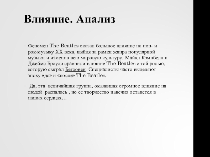 Феномен The Beatles оказал большое влияние на поп- и рок-музыку