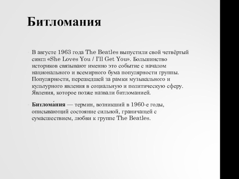 Битлома́ния — термин, возникший в 1960-е годы, описывающий состояние сильной, граничащей с сумасшествием, любви к группе The Beatles.