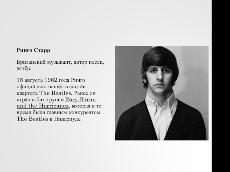 в состав квартета The Beatles. Ранее он играл в бит-группе Rory Storm and the Hurricanes, которая в то время была главным конкурентом The Beatles в Ливерпуле.