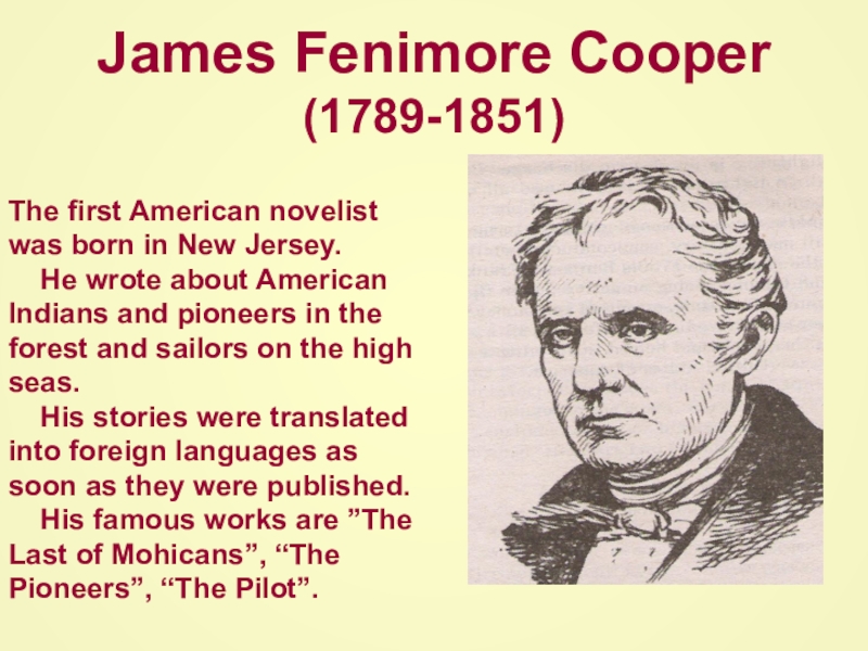 His famous works are ”The Last of Mohicans”, “The Pioneers”, “The Pilot”.