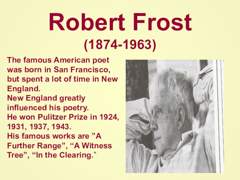 His famous works are ”A Further Range”, “A Witness Tree”, “In the Clearing.”