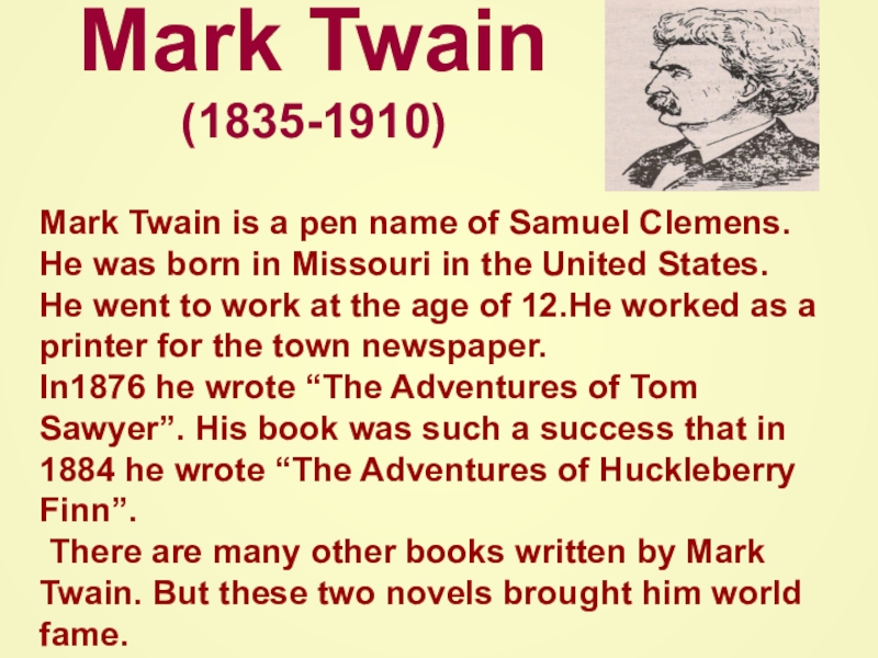 There are many other books written by Mark Twain. But these two novels brought him world fame.