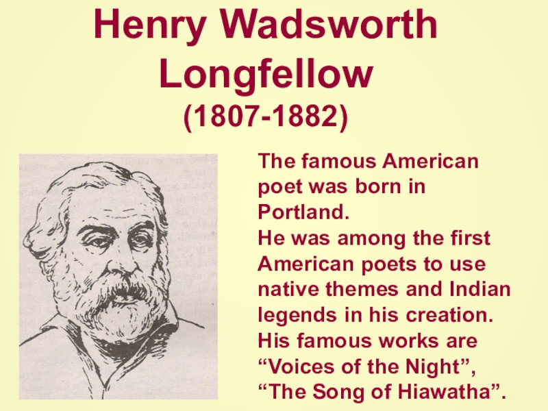 His famous works are “Voices of the Night”, “The Song of Hiawatha”.