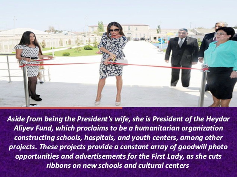 Heydar Aliyev Fund, which proclaims to be a humanitarian organization constructing schools, hospitals, and youth centers, among other projects. These projects provide a constant array of goodwill photo opportunities and advertisements for the First Lady, as she cuts ribbons on new schools and cultural centers.