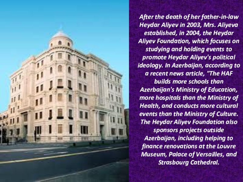 Слайд 14After the death of her father-in-law Heydar Aliyev in 2003, Mrs.