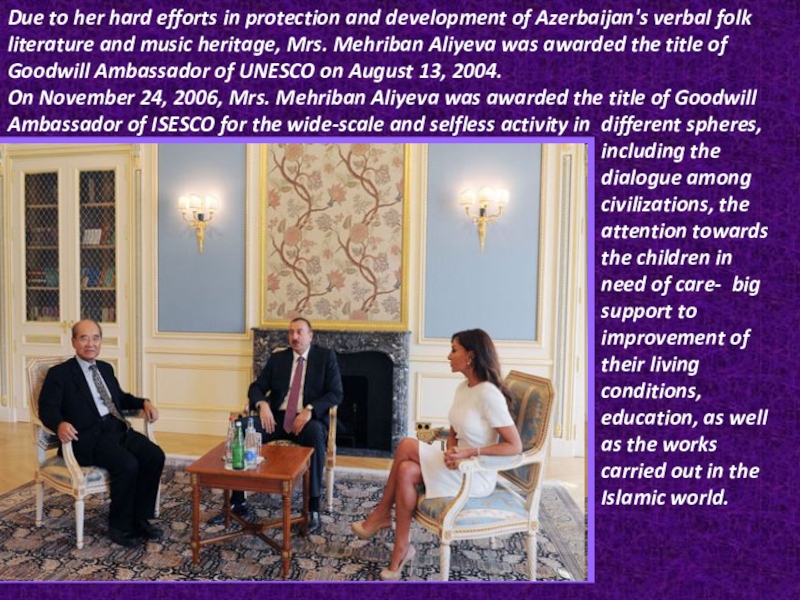 verbal folk literature and music heritage, Mrs. Mehriban Aliyeva was awarded the title of Goodwill Ambassador of UNESCO on August 13, 2004.
