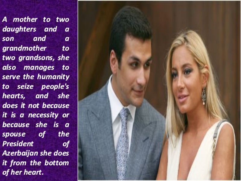 to two grandsons, she also manages to serve the humanity to seize people's hearts, and she does it not because it is a necessity or because she is a spouse of the President of Azerbaijan she does it from the bottom of her heart.