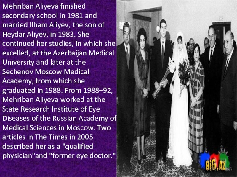 Слайд 9Mehriban Aliyeva finished secondary school in 1981 and married Ilham Aliyev,