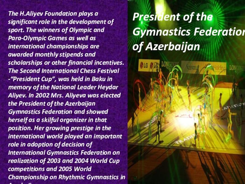 sport. The winners of Olympic and Para-Olympic Games as well as international championships are awarded monthly stipends and scholarships or other financial incentives. The Second International Chess Festival -“President Cup”, was held in Baku in memory of the National Leader Heydar Aliyev. In 2002 Mrs. Aliyeva was elected the President of the Azerbaijan Gymnastics Federation and showed herself as a skilful organizer in that position. Her growing prestige in the international world played an important role in adoption of decision of International Gymnastics Federation on realization of 2003 and 2004 World Cup competitions and 2005 World Championship on Rhythmic Gymnastics in Azerbaijan