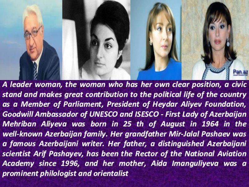 a civic stand and makes great contribution to the political life of the country as a Member of Parliament, President of Heydar Aliyev Foundation, Goodwill Ambassador of UNESCO and ISESCO - First Lady of Azerbaijan Mehriban Aliyeva was born in 25 th of August in 1964 in the well-known Azerbaijan family. Her grandfather Mir-Jalal Pashaev was a famous Azerbaijani writer. Her father, a distinguished Azerbaijani scientist Arif Pashayev, has been the Rector of the National Aviation Academy since 1996, and her mother, Aida Imanguliyeva was a prominent philologist and orientalist