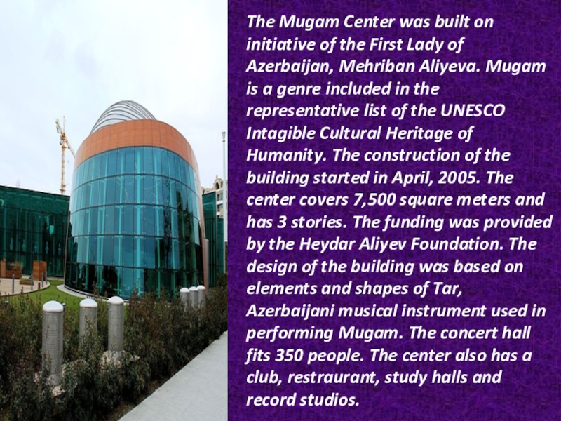 of Azerbaijan, Mehriban Aliyeva. Mugam is a genre included in the representative list of the UNESCO Intagible Cultural Heritage of Humanity. The construction of the building started in April, 2005. The center covers 7,500 square meters and has 3 stories. The funding was provided by the Heydar Aliyev Foundation. The design of the building was based on elements and shapes of Tar, Azerbaijani musical instrument used in performing Mugam. The concert hall fits 350 people. The center also has a club, restraurant, study halls and record studios.
