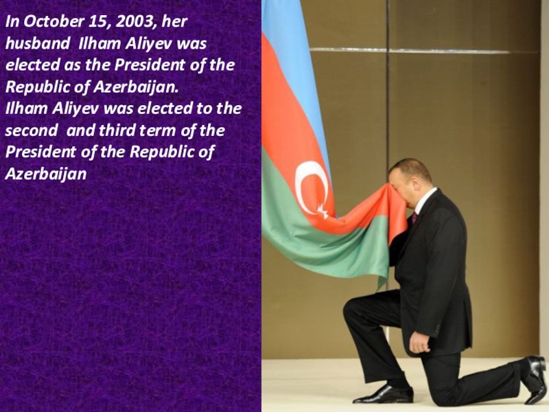 Слайд 11In October 15, 2003, her husband Ilham Aliyev was elected as
