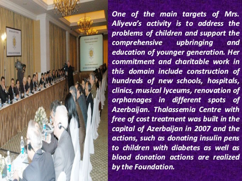 Слайд 20One of the main targets of Mrs. Aliyeva’s activity is to