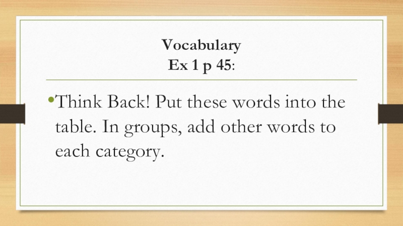 Vocabulary  Ex 1 p 45:Think Back! Put these words into the table. In groups, add other