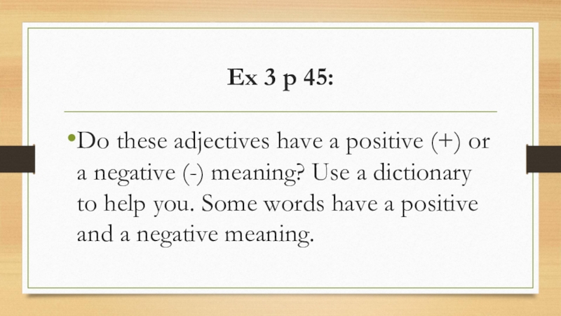 Ex 3 p 45:Do these adjectives have a positive (+) or a negative (-) meaning? Use a