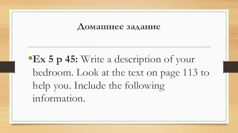 Домашнее задание Ex 5 p 45: Write a description of your bedroom. Look at the text on
