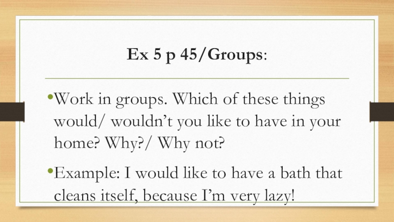 Ex 5 p 45/Groups:Work in groups. Which of these things would/ wouldn’t you like to have in