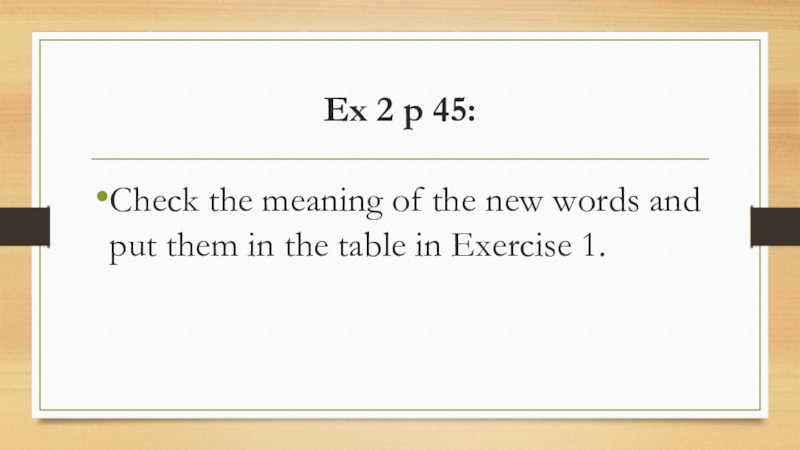 Ex 2 p 45:Check the meaning of the new words and put them in the table in