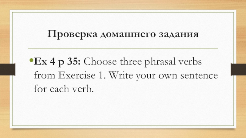 Проверка домашнего заданияEx 4 p 35: Choose three phrasal verbs from Exercise 1. Write your own sentence