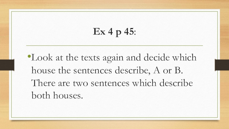 Ex 4 p 45:Look at the texts again and decide which house the sentences describe, A or