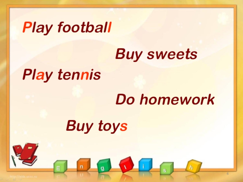 Play footballBuy sweetsPlay tennisBuy toysDo homework