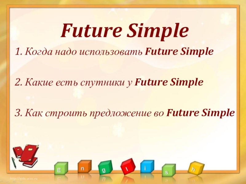 Future Simple1. Когда надо использовать Future Simple2. Какие есть спутники у Future Simple3. Как строить предложение во