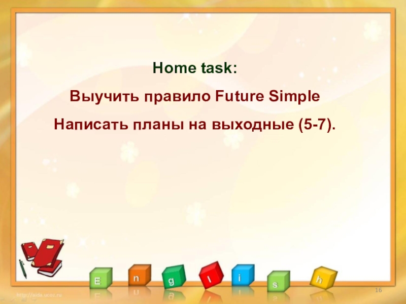 Home task:Выучить правило Future SimpleНаписать планы на выходные (5-7).