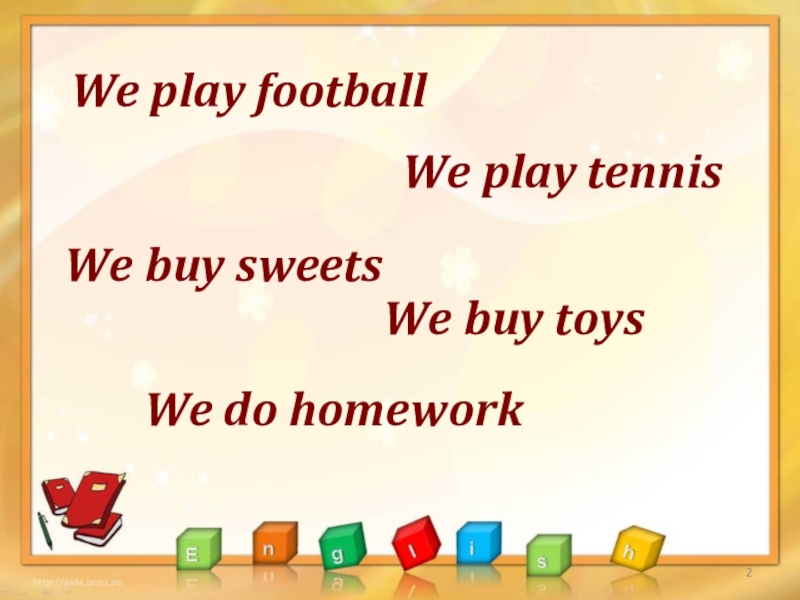 We play footballWe buy sweetsWe play tennisWe buy toysWe do homework