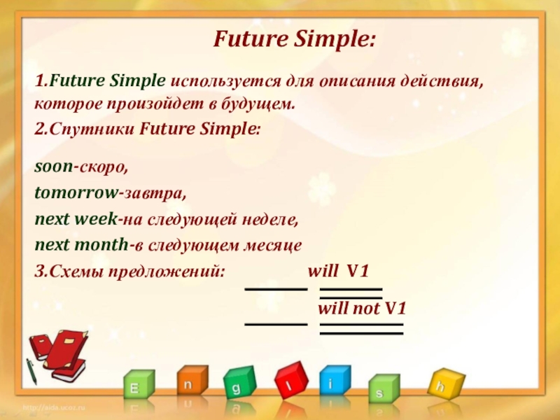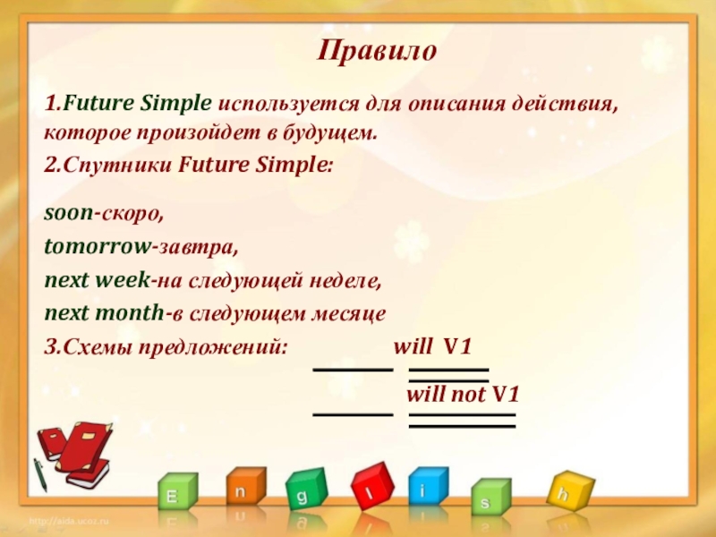 Правило1.Future Simple используется для описания действия, которое произойдет в будущем.2.Спутники Future Simple: soon-скоро, tomorrow-завтра, next week-на следующей