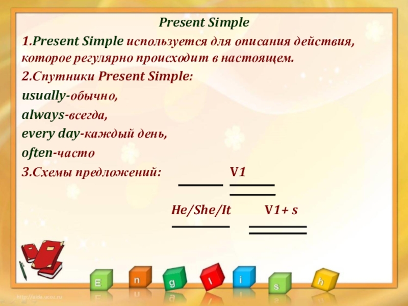 Present Simple1.Present Simple используется для описания действия, которое регулярно происходит в настоящем.2.Спутники Present Simple: usually-обычно, always-всегда, every