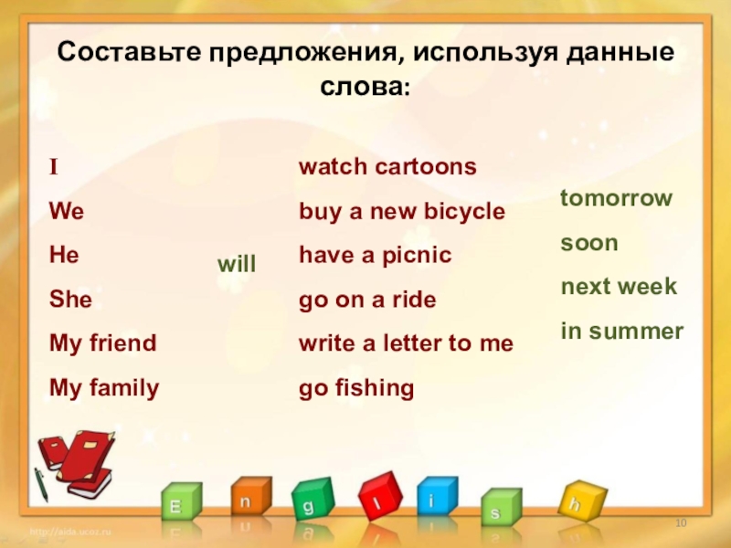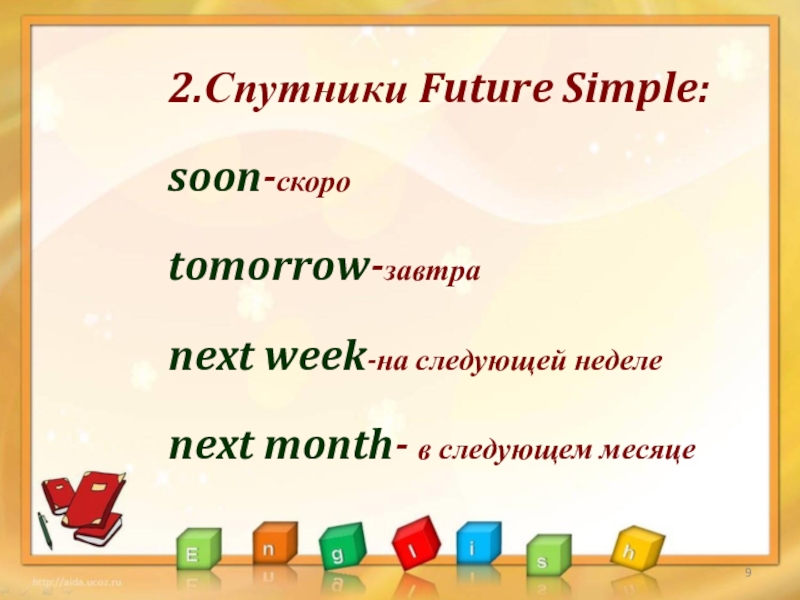 2.Спутники Future Simple:soon-скороtomorrow-завтраnext week-на следующей неделеnext month- в следующем месяце