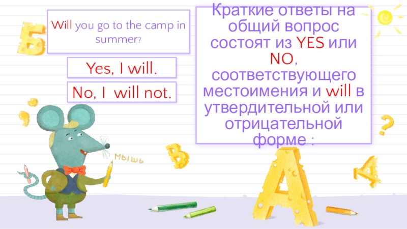 Краткие ответы на общий вопрос состоят из YES или NO, соответствующего местоимения и will в утвердительной или отрицательной форме :