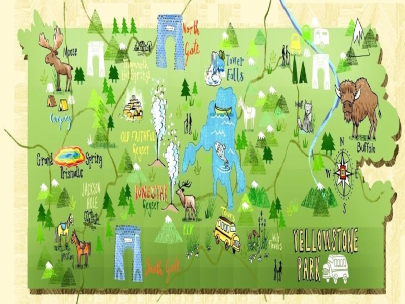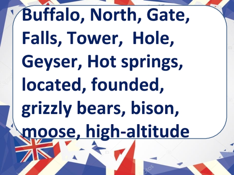 Слайд 2Buffalo, North, Gate, Falls, Tower, Hole, Geyser, Hot springs, located, founded,