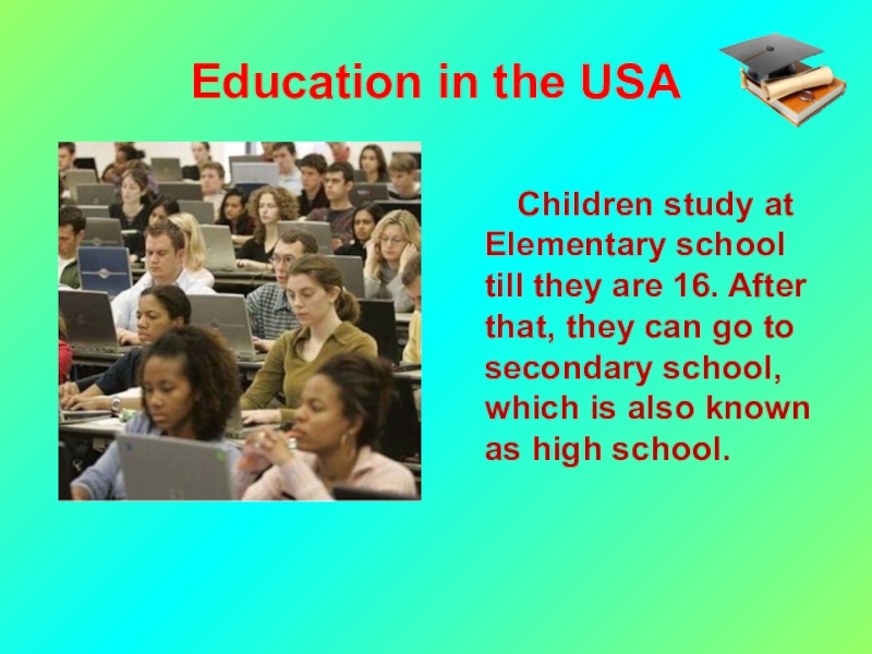 Education in the USA     Children study at Elementary school till they are 16.
