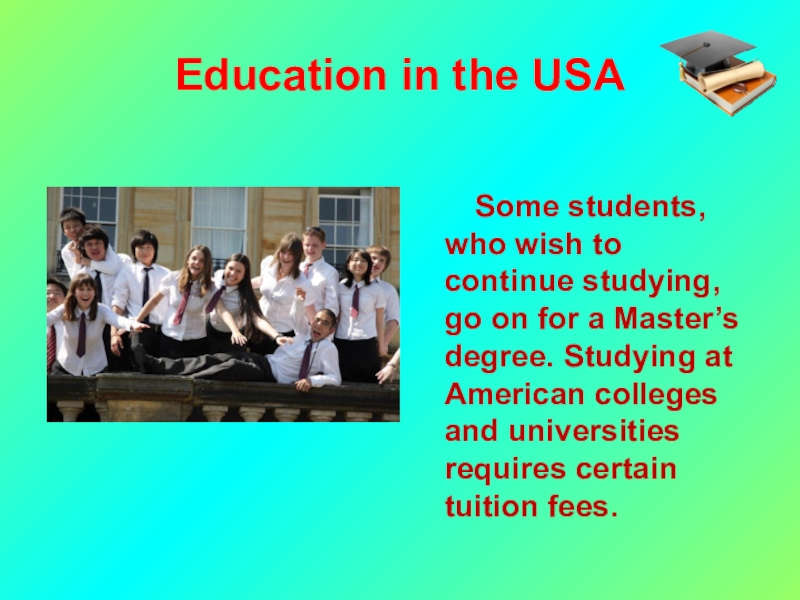 Education in the USA    Some students, who wish to continue studying, go on for