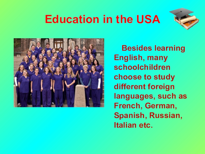 Education in the USA     Besides learning English, many schoolchildren choose to study different
