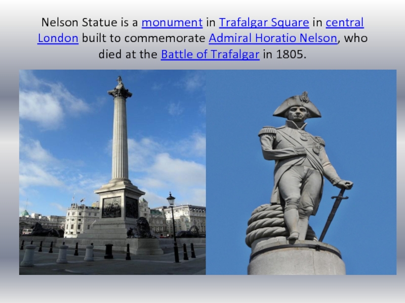 Слайд 18Nelson Statue is a monument in Trafalgar Square in central London built to commemorate Admiral Horatio Nelson, who