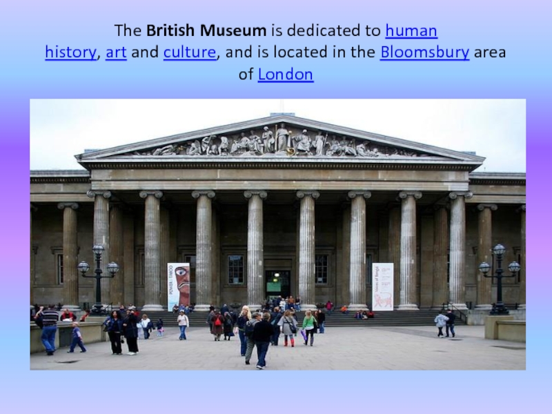 Слайд 23The British Museum is dedicated to human history, art and culture, and is located in the Bloomsbury area of London