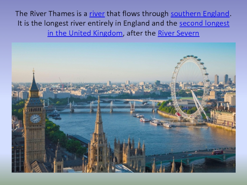 Слайд 20The River Thames is a river that flows through southern England. It is the